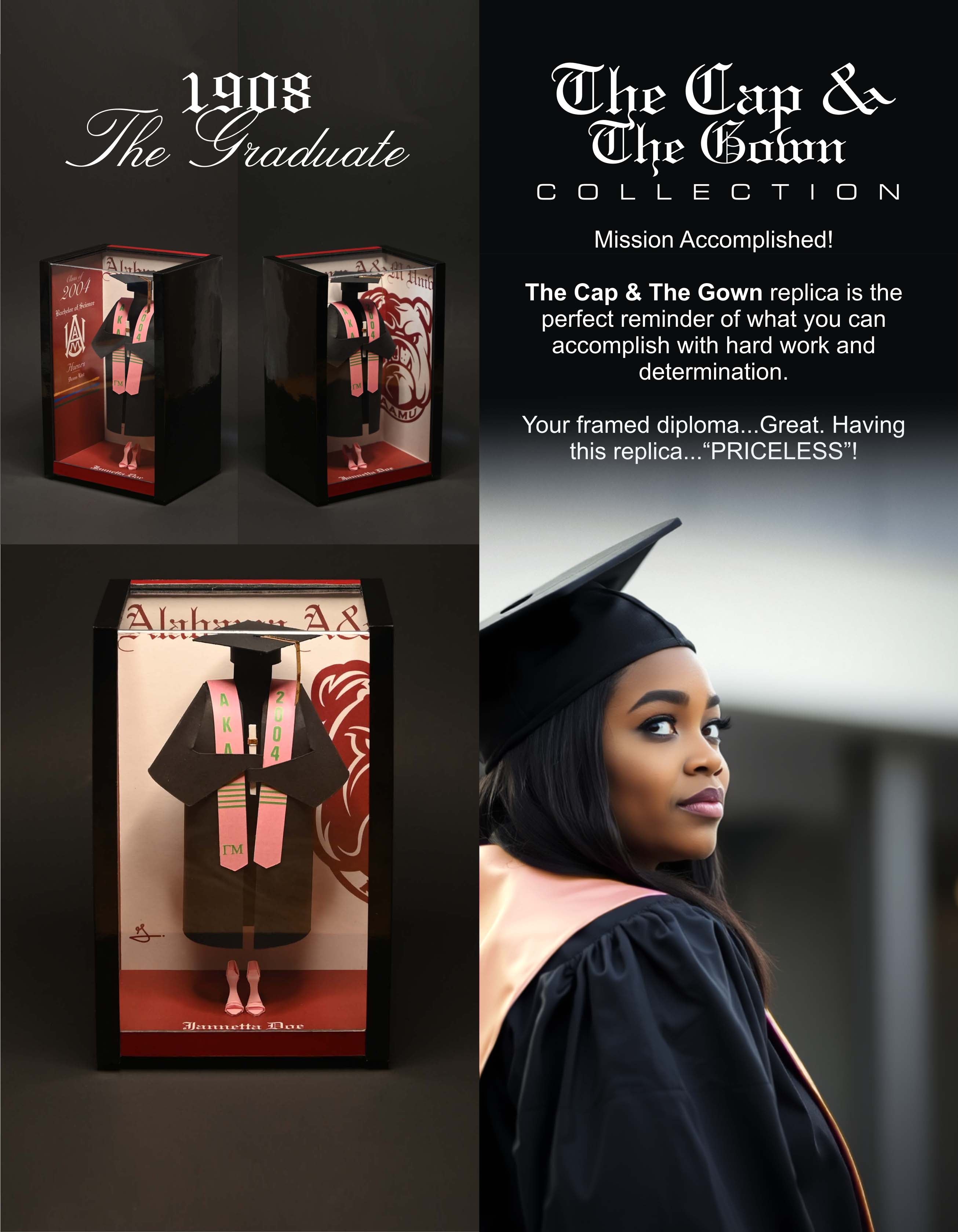 “The Cap & The Gown” is the ultimate graduation gift—an extraordinary, handcrafted masterpiece unlike anything else on the market. Designed to inspire and commemorate, it’s a striking addition to any mantel, desk, or bookshelf, serving as a daily reminder of hard work, achievement, and pride.